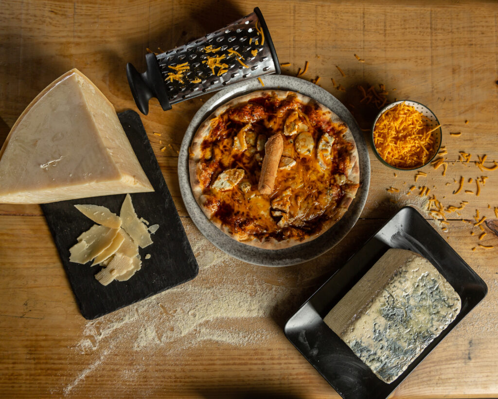 BASE ESPECIAL QUEEN, QUESO MOZZARELLA, QUESO DE CABRA, EMMENTAL, GORGONZOLA, CHEDDAR, GRANA PADANO, SALSA WAILUKU.